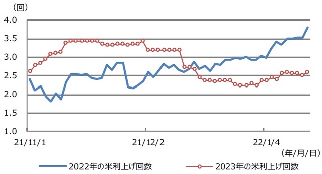 このように、FRBはテーパリング開始の織り込みを、かなり慎重に進めてきました。その結果、実際にテーパリングが始まっても、市場に大きな混乱はみられませんでした。ただ、FRBは昨年11月頃から、想定以上の米物価の高い伸びを受け、急速にタカ派色を強めています。実際、テーパリングについても、パウエル議長が11月の議会証言で早期終了を示唆し、12月のFOMCで早期終了が正式決定されました。