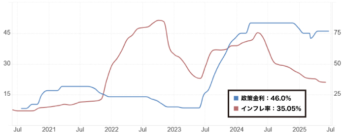2025年6月には35.05%のインフレ率を記録し、政策金利(