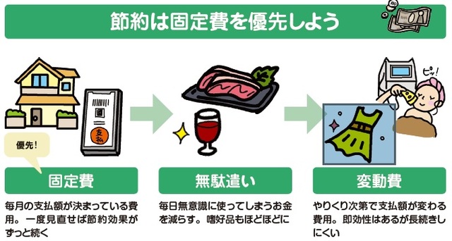 節約で大切なのは、優先順位をつけること。節約は固定費から行いましょう。固定費とは、毎月決まって一定額発生する費用です。住居費、通信費、水道・光熱費、保険料、自動車費、その他年会費や月会費などが当てはまります。