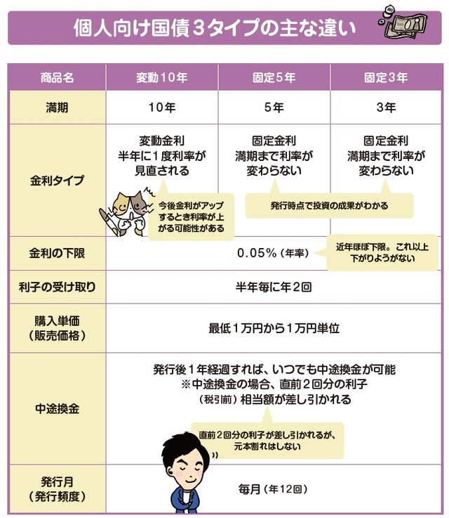 個人向け国債には、満期までの期間と金利のタイプによって「固定3年」「固定5年」「変動10年」の3種類が用意されています。おすすめは半年ごとに金利が見直される「変動10年」です。現状、個人向け国債の金利はどれも下限の0.05%。しかし今後、市場金利が上昇した場合に、金利が見直されて上昇する可能性があるのは変動10年のみだからです。
