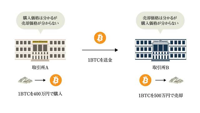 しかし、「取引所A」は購入情報のみ、「取引所B」は売却情報のみしか持っていないため、両取引所はこの一連の取引における利益額を計算することができません[イメージ]。
