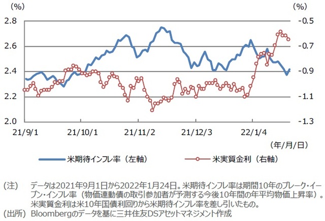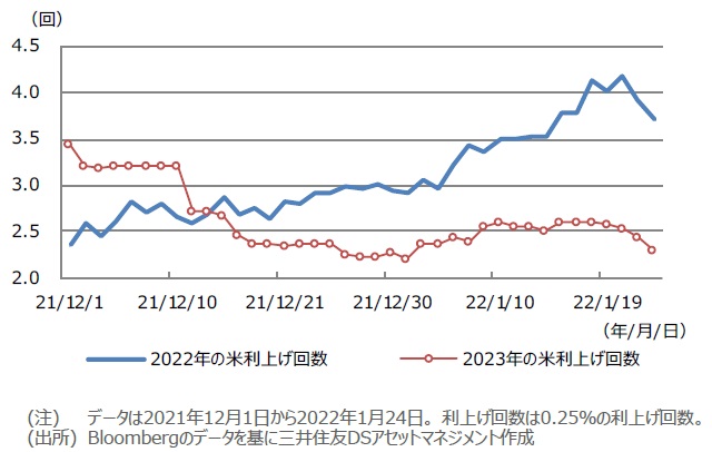 市場で適度に正常化ペースの織り込みが進めば、「インフレ抑制→株高」も期待できますが、過度に織り込みが進めば、「景気腰折れ→株安」となります。実際、先週後半以降は後者の流れとなり、市場は原油安、米10年国債利回り低下、株安で反応しています。また、FF金利先物市場における利上げの織り込みも後退し、1月24日時点で2022年は約3.7回、2023年は約2.3回に、それぞれ減少しました。