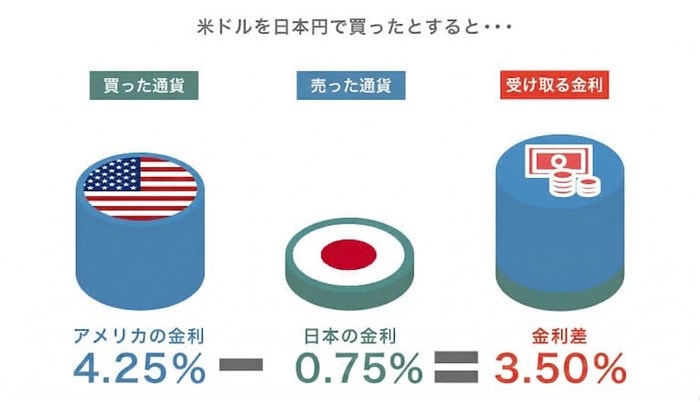 日本円で米国ドルを買うと、金利は4.25%を受け取れて0.75%を手放さなければなりません。