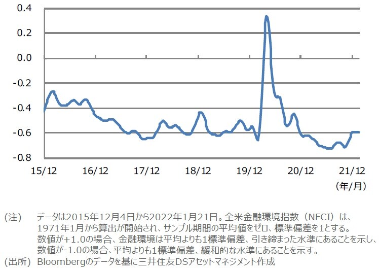 ただ、形式的にでもFF金利が上昇すれば、より長い期間の金利に上昇圧力が生じ、実体経済に影響します。また、今回の利上げペースは前回よりも速くなる見通しのため、市場の警戒も強まっています。しかしながら、資金調達の容易さを測る代表的な指標である全米金融環境指数(NFCI)をみると、前回の利上げ局面における金融環境は平均よりも緩和的であり(図表2)、量的緩和後の利上げにあまり過度な警戒は必要ないように思われます。