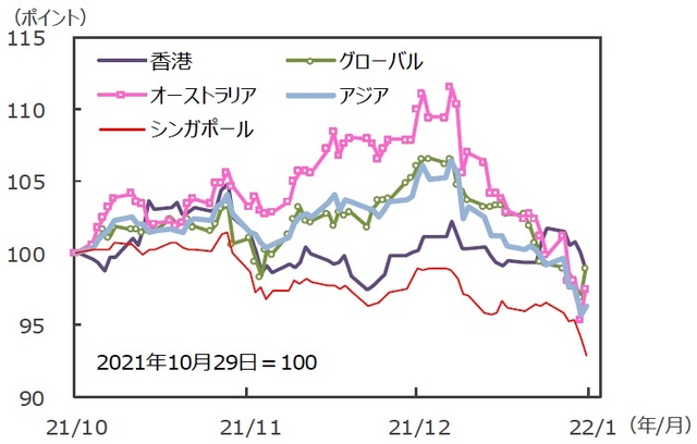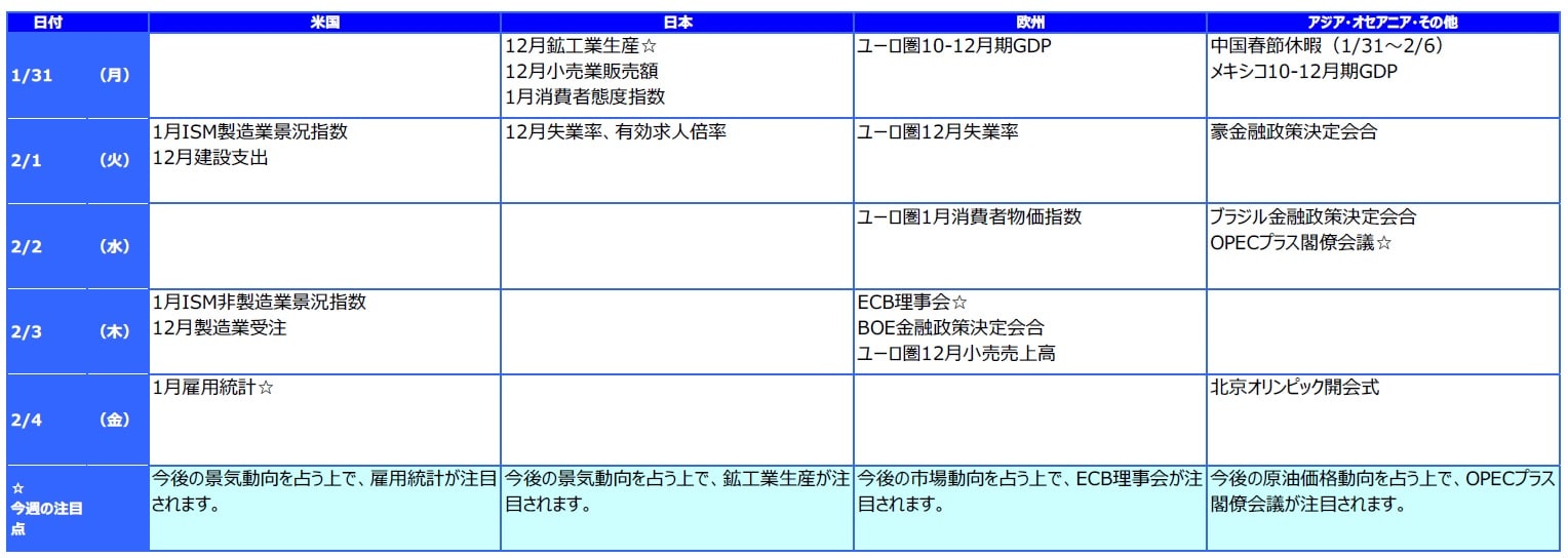 世界の主要株式市場は、米国市場を除き下落しました。米国株式市場は、連邦準備制度理事会(FRB)による早期利上げ観測やウクライナ情勢の緊迫化から連日乱高下を繰り返しましたが、好調な企業決算を受けて週末に急反発し、上昇して終了しました。NYダウは週間で1.34%高となりました。連邦公開市場委員会(FOMC)では次回3月会合での利上げ開始やその後のバランスシート縮小が示唆され、記者会見でパウエルFRB議長がタカ派的な姿勢を示したことからハイテク株を中心に値を崩す場面がありました。一方、日本株式市場は、FRB議長の発言でハイテク株が売られたことなどを嫌気して、続落しました。日経平均株価は2.92%安で終了しました。欧州株式市場も、早期米利上げ観測やウクライナ情勢をめぐる不透明感から下落しました。独DAX指数が1.83%安、英FTSE100指数は0.37%安となりました。中国株式市場では、中国本土市場の上海総合指数が4.57%安、香港ハンセン指数は5.67%安で終了しました。