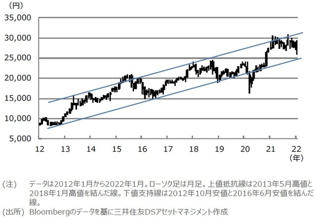 次に、長期の視点で考えてみます。日経平均株価は、2013年5月高値と2018年1月高値を結んだ上値抵抗線と、2012年10月安値と2016年6月安値を結んだ下値支持線によって、上昇トレンドが形成されています(図表2)。これをみると、1月の下落によって下値支持線を割り込むような展開にはなっておらず、日経平均株価のトレンド自体は、まだ上向きと解釈できます。