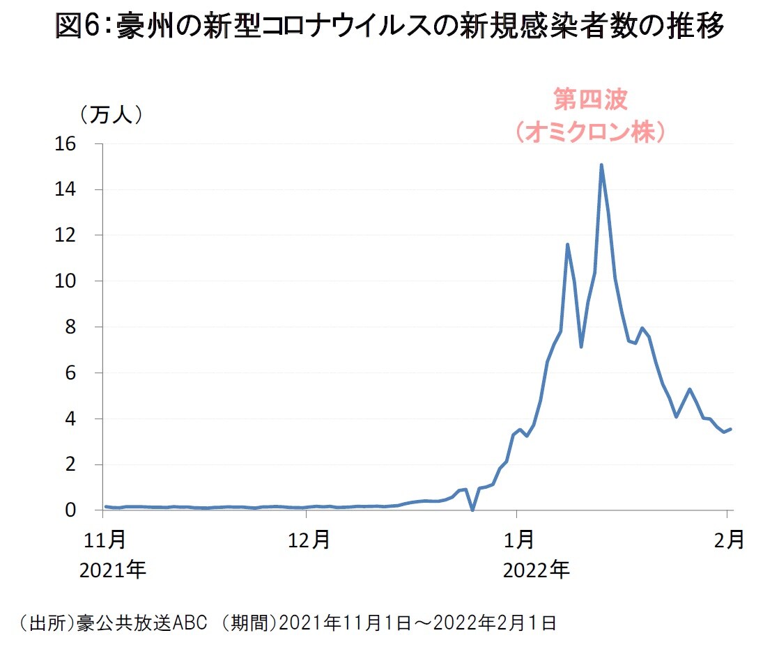 一方、豪州の経済動向の面では、コロナの感染終息に向けた明るい兆候もみえつつあります。オミクロン株の感染第四波は1月中旬をピークに収まりつつあります[図表6]。