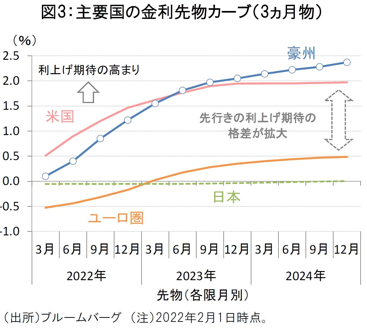 また、豪州の金利先物市場では、2023年から2024年にかけて米国を上回る利上げ期待が引き続き織り込まれています[図表3]。利上げに対して慎重なハト派姿勢を崩さないRBAに対しては、今後も市場が早期の利上げを催促する相場展開が続く可能性が高そうです。