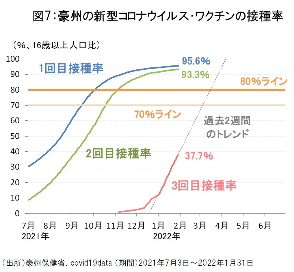 足元ではオミクロン株の変異種の感染拡大への懸念が残るものの、3回目のワクチン接種率の上昇が感染の抑制要因になると期待されます。豪州での3回目接種率は1月31日時点で37.7%へ順調に上昇しています[図表7]。