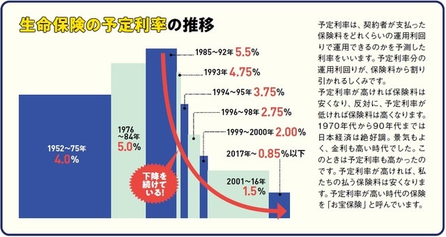 「転換で必ず損をする」のは、予定利率が低くなるからです。予定利率は保険料を割り引いてくれる率をいいます。予定利率の高い保険は、割引率が高い保険です。私たちにとっては、保険料が安くなります。予定利率の高い保険を「お宝保険」と呼んでいます。うっかり手放さないように。