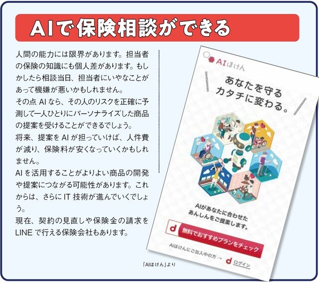 では、AIに相談したらどうでしょうか? ドコモと東京海上日動火災保険は、「AIほけん」を運営。このサービスは、簡単な質問への回答と、登録済みのプロフィールや、各種サービスの利用状況などに基づき、AIが11種類の保険・サービスから商品を提案してくれます。