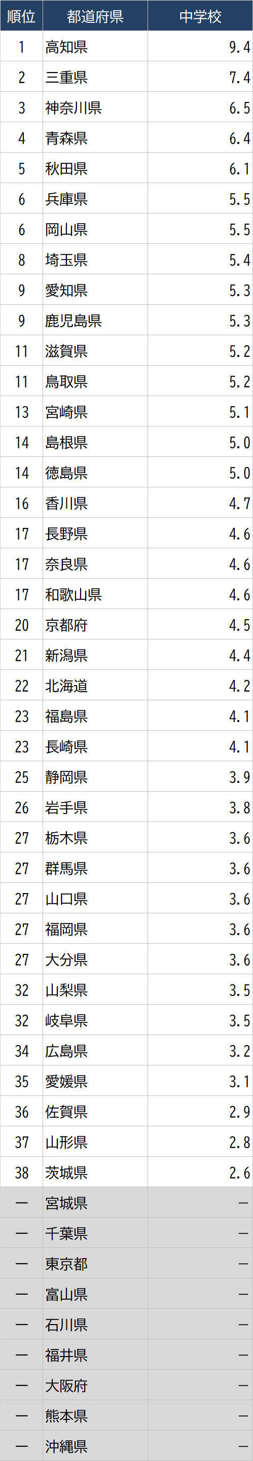 ※中学校と高等学校の試験区分を(一部)分けずに選考を行っている県市の受験者数は、中学校の受験者数に含んでいる。そのため、以下の県については、競争率を「-」としている。宮城県、千葉県、東京都、富山県、石川県、福井県、沖縄県