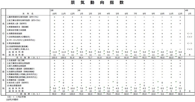 ●また、1月分の先行DIでは、数値が判明している消費者態度指数、日経商品指数、東証株価指数、中小企業売上げ見通しDIの4系列では、日経商品指数、中小企業売上げ見通しDIの2系列がプラス符号に、消費者態度指数、東証株価指数の2系列がマイナス符号になることが判明している。1月分速報値段階の先行DIは22.2%以上77.8%以下になることが確定している。