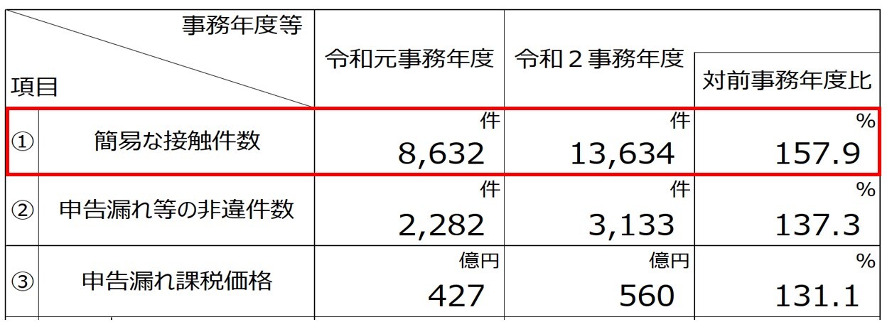 こちらは従来からも行われていた方法ですが、令和2事務年度で急増し、前事務年度比で157.9%となっており、13,634件は集計が始まった平成28事務年度以降で最高の件数です。実地調査が5,106件ですので、その2.6倍以上の簡易な接触が行われているわけです。国税庁も「効果的・効率的」に「適正・公平な課税」を目的として簡易な接触を活用していると言っています。今後も簡易な接触は実地調査より高い水準で行われるものと推察されます。