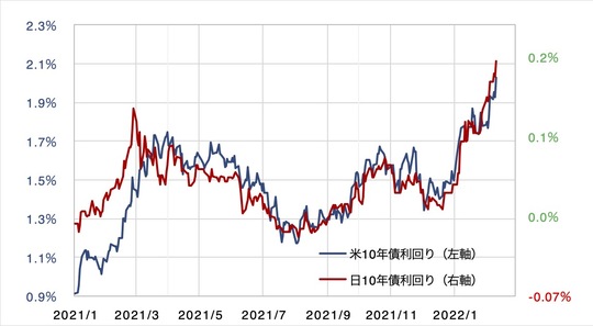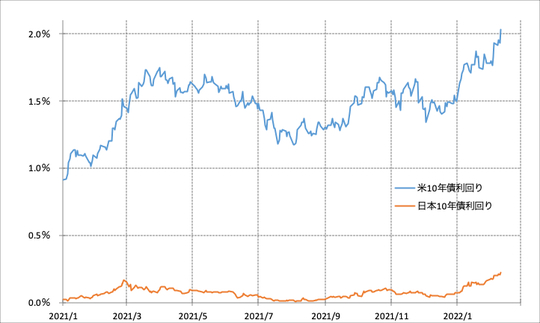 そう考える理由のひとつに、米国などの長期金利上昇がこの先も続いた場合、日銀の政策で、日本の長期金利だけ上昇を抑制することが果たしてできるかという疑問があります。昨年からの日米の10年債利回りの推移である、図表1を見ると、両者は水準も値幅も大きな差があることがわかるでしょう。