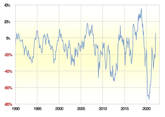 そんな日米2年債利回り差と米ドル/円の関係も、年明け以降はかい離が目立っています。米インフレ率の上昇が続くなかで、名目金利からインフレ率を引いた実質金利の低下などを理由に、名目金利上昇の通貨高への影響が低下している可能性があります。