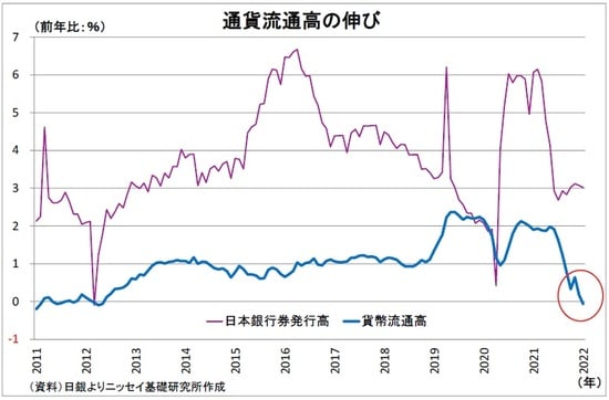 日銀より2月7日に公表された「通貨流通高」によれば、今年1月の貨幣(以下、「硬貨」と表記)流通高1は前年比0.1%減と前年の水準を下回った(図表1)。硬貨の流通高が前年割れとなったのは、2012年5月以来、約10年ぶりのことだ。昨年6月までは前年比で2%前後の高い伸びを維持していたのだが、7月以降、伸び率が急速に低下した。