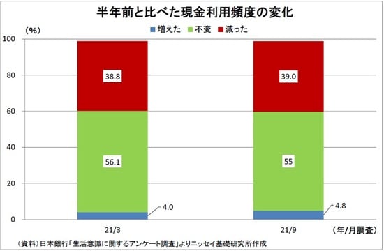 また、積極的に貯金箱貯金をしていない人でも、日々受け取ったお釣りを家庭等に置き続けると、「意図せざる硬貨貯金」を抱えることになり、同様に扱いに困ることになりかねない。従って、今後は硬貨を手元に貯めすぎないように「家庭等に滞留する硬貨を優先的に日々の小まめな支払いに充てる」という動きや、「そもそも硬貨の受け取りを発生させないようにキャシュレス決済にシフトする」動きが活発化する可能性がある。後者の場合はキャッシュレス化の動きを促進させることになる。