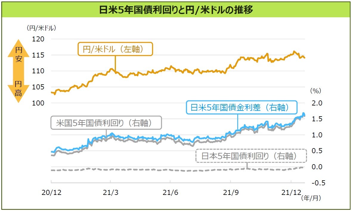 ⻑期⾦利に⽐べて⾦融政策の影響を受けやすいとみられる中短期国債(例として⽇⽶5年国債)の⾦利差をみると、円/⽶ドル相場の動きと相関が⾼くなっていることがわかります。