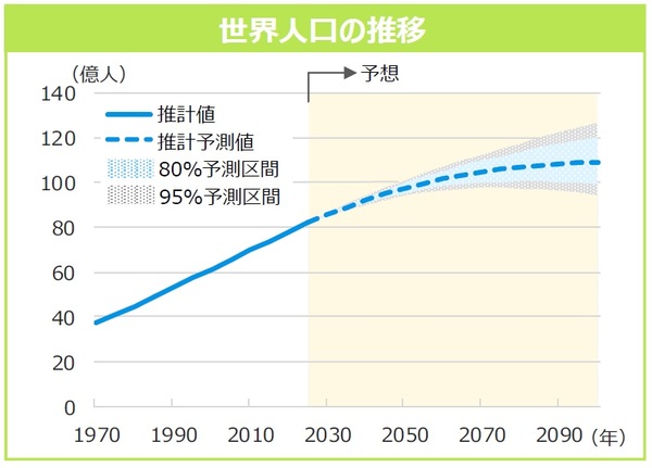 世界⼈⼝は2020年の78億⼈から、2100年には95%の確率で94億〜127億⼈に達すると予測されていることから、今後も世界的な経済成⻑は続くと⾒込まれます。