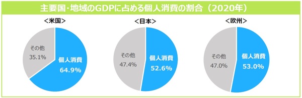 経済活動の中でも、個⼈消費は重要な要素であり、各国・地域のGDPにおいても、大きな割合を占めています。個⼈消費が活発化することで、企業の業績向上につながることが⾒込まれます。