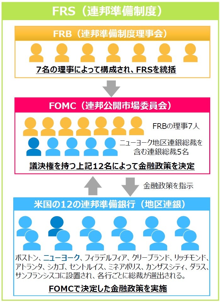 FRBの理事は⾦融政策決定会合であるFOMC(連邦公開市場委員会)に全員出席し、会議での議決権を保有します。また、他にもニューヨーク地区連銀総裁、ニューヨーク以外の地区連銀から選ばれた4⼈の総裁も議決権を保有しており、計12名によって⾦融政策を決定します。