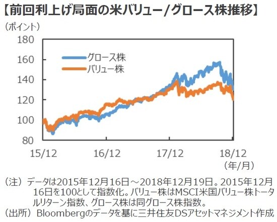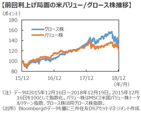 ■ちなみに、直近の利上げ局面(2015年12月16日から2018年12月19日)では、米国グロース株は約30%上昇しており、米国バリュー株を約10%アウトパフォームしています。