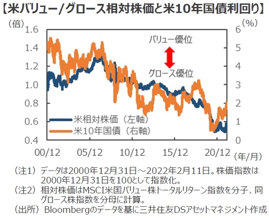 ■ちなみに、過去20年ほどの米国株式市場の動向を見ると、バリュー株とグロース株の優劣は、おおむね長期金利の動きに沿う形で推移しています。