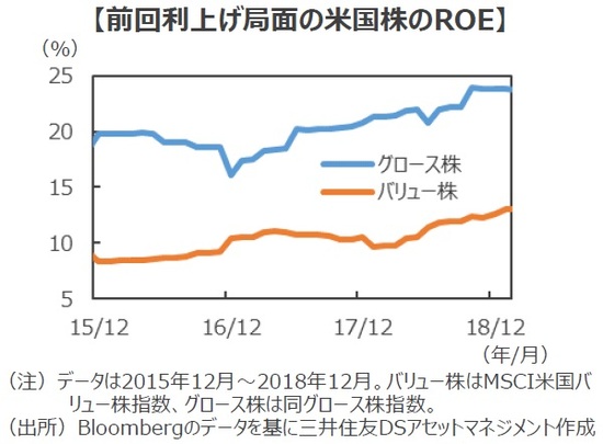 ■利上げ局面にもかかわらず米国グロース株が堅調に推移した背景には、前回の利上げが比較的小幅でそのペースも緩やかであったことも一因と言えそうです。しかし、米国グロース株の上昇にとってより重要であったのは、力強く事業を拡大し、高水準の株主資本利益率(ROE)を更に向上させた、高い収益性や盤石なビジネスモデルを背景にした力強い業績の伸びに他ならないでしょう。