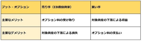 オプションの概念は保険契約に近い。保険(オプション)の買い手は、保険料(オプション料)を支払い、保険の売り手は保険料(オプション料)を受け取ることができる。EB債では、オプション料が相対的に高い金利の原資となっている。