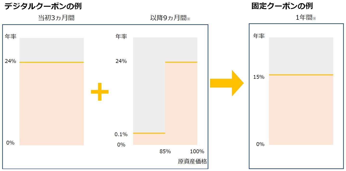 デジタルクーポンとは、対象銘柄の株価・価格が、各利率決定日にあらかじめ定められた水準(利率決定価格)以上となったか、未満となったかによって決定される利率のことをいう。各利率決定日に、対象銘柄の株価・価格が利率決定価格以上の場合には高い方の利率が適用され、利率決定価格を下回った場合には低い方の利率が適用される。