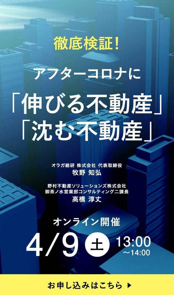 2022年4月9日(土)13:00より、野村不動産ソリューションズ主催「徹底検証!アフターコロナに『伸びる不動産』『沈む不動産』」(オンライン)を開催します。これからの不動産市況の動向、富裕層の不動産資産承継の課題など、アフターコロナに起きる「不動産価値」の変化について、オラガ総研株式会社代表取締役の牧野知弘氏と不動産売買の最前線にいる野村不動産ソリューションズの社員との対談形式で紐解いていきます。