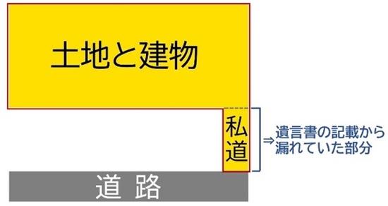 本事例の遺言書には、土地と建物については登記簿謄本のとおりに記載されていましたが、旗竿地の“竿”にあたる私道部分の記載が漏れていました。