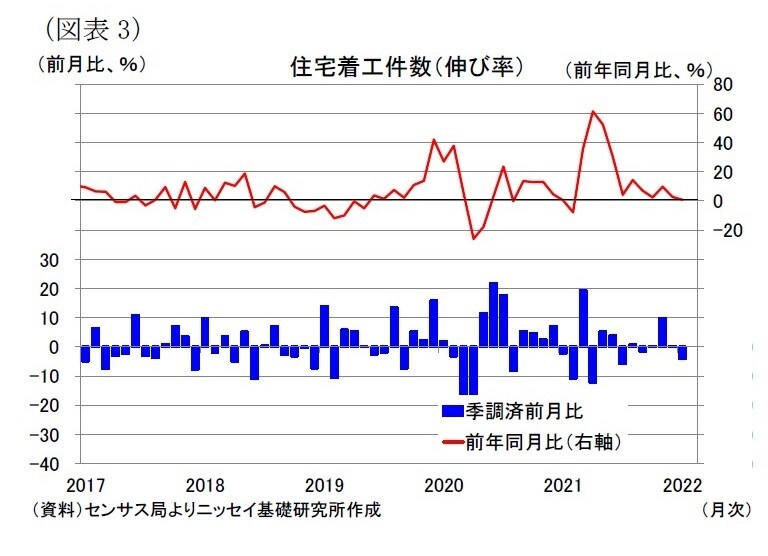 住宅着工件数の伸びは前月比▲4.1%(前月:+0.3%)と4ヵ月ぶりにマイナスに転じた[図表3]。
