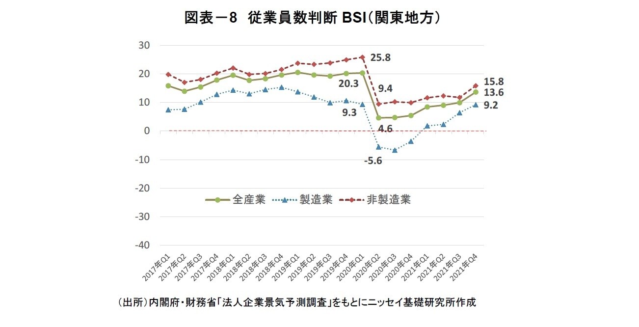 内閣府・財務省「法人企業景気予測調査」によれば、「関東地方」の「従業員数判断BSI」(全産業)※は、2020年第1四半期の+20.3から2020年第2四半期の+4.6へ大きく低下した後、緩やかな回復が続いており、2021年第4四半期は+13.6となった[図表8]。