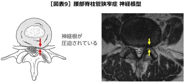 次に神経根型の脊柱管狭窄症ですが、本幹から枝分かれした神経根が、骨と骨に挟まれて症状をもたらします(図表9)。
