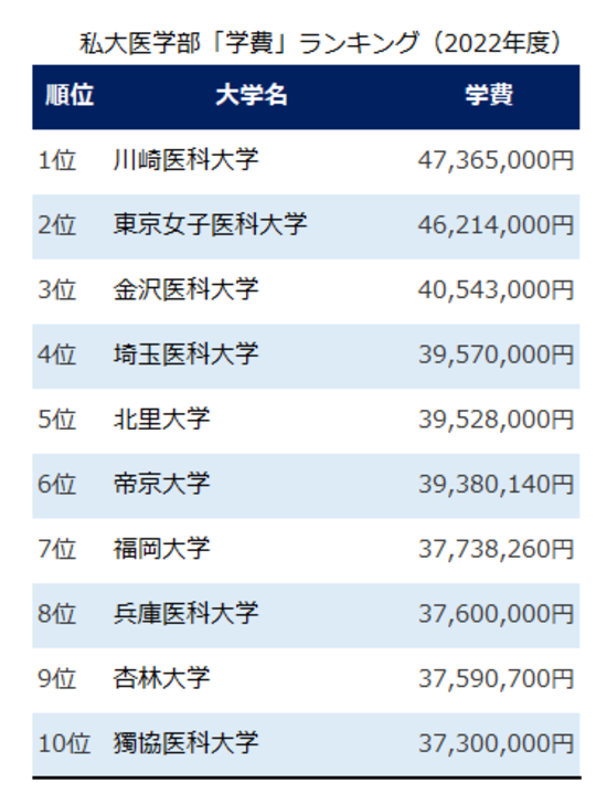 私大医学部学費ランキング1位~10位(2022年度)