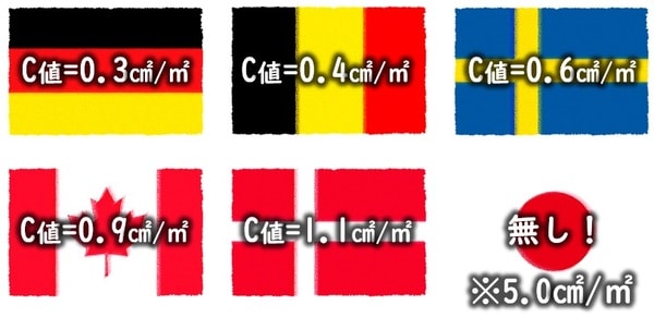 欧米の国々では気密性能の基準が定められています。我が国では、平成11年基準というかなり緩い省エネ基準があることにはあったのですが、この緩い基準ですら、その後の省エネ基準の改正により不思議なことになくなってしまいました([図表6])。