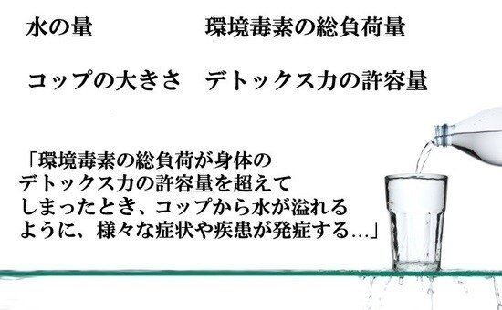 そしてこの環境毒素の総負荷量(水の量)が、身体のデトックス能力(コップの大きさ)を超えてしまったとき、コップから水が溢れるように、いろいろな症状や疾患を起こすのです。