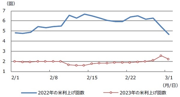 なお、フェデラルファンド(FF)金利先物市場では、このところ米利上げの織り込みが後退しつつあります(図表2)。ただ、前述の通り、SWIFT排除に関する西側諸国の配慮次第で、インフレと景気減速への懸念は軽減される余地があり、また、金融システム動揺の恐れも小さいとみられるため、米連邦準備制度理事会(FRB)は今月から利上げを開始し、よほど状況が急変しない限り、しばらく利上げ姿勢を維持する可能性が高いと考えています。