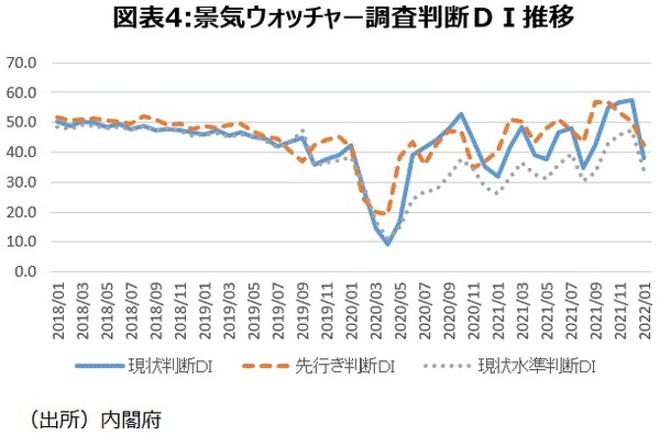 21年では1月8日~3月21日、4月25日~6月20日、7月12日~9月30日の合計3度(対象地域は様々)の緊急事態宣言が発令された。実質GDPや景気ウォッチャー調査の現状判断DIなどは、発令の度に影響を受け変動が生じ、ジグザグと推移した(図表4)。