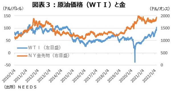 ロシアによるウクライナへの軍事侵攻の影響で原油価格や小麦粉の値上がりが懸念される。原油価格は3月1日のWTIが103.41ドル/バレルと2014年7月以来7年8ヵ月ぶりの水準に上昇した。安全資産である金価格も大きく上昇している(図表3)。