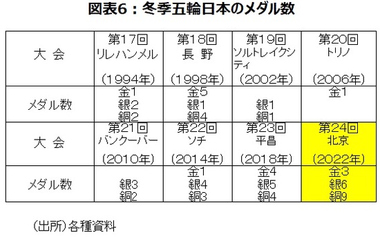 日本選手の活躍で金メダル3個、銀メダル6個、銅メダル9個、合計18個と、過去最高のメダル獲得となったが、いつものオリンピックと違い、モヤモヤ感が残った(図表6)。