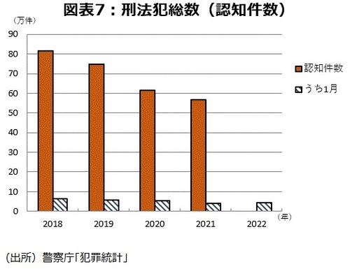 刑法犯総数の認知件数は近年減少傾向にあり、昨年は56.8万件と前年比▲7.5%の減少であった。但し、22年になって最初の1月分で異変が起きた。4.2万件で、前年同月比+1.8%と増加に転じた(図表7)。2月分以降の動向は要注目だ。