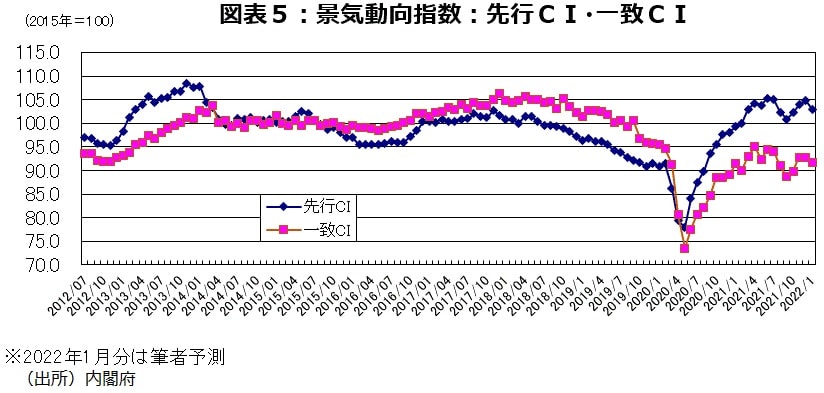 1月分の景気動向指数・一致CIは前月差2ヵ月連続の下降になるとみられる(図表5)。