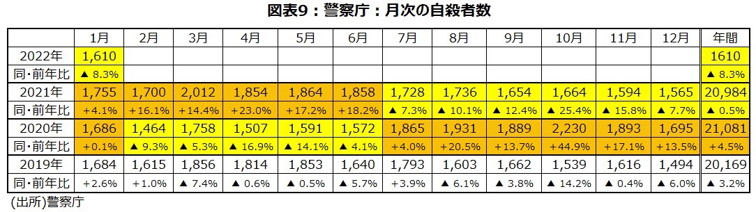 完全失業率は21年平均では2.8%と20年と同じになった。また、21年12月は2.7%である。21年で最も高かった月は5月の3.0%で一番低かったのは3月の2.6%であった。コロナ禍でも、様々な対策の効果で、落ち着いた数字となっている。完全失業率と相関が高い自殺者数は、21年前半は前年同月比増加傾向だったが、21年後半と22年1月は7ヵ月連続減少だ。警察庁発表の21年の自殺者数は、20,984人、前年比は▲0.5%の減少である。22年1月暫定値の自殺者数は1,610人で、前年同月比▲8.3%の減少だ(図表9)。