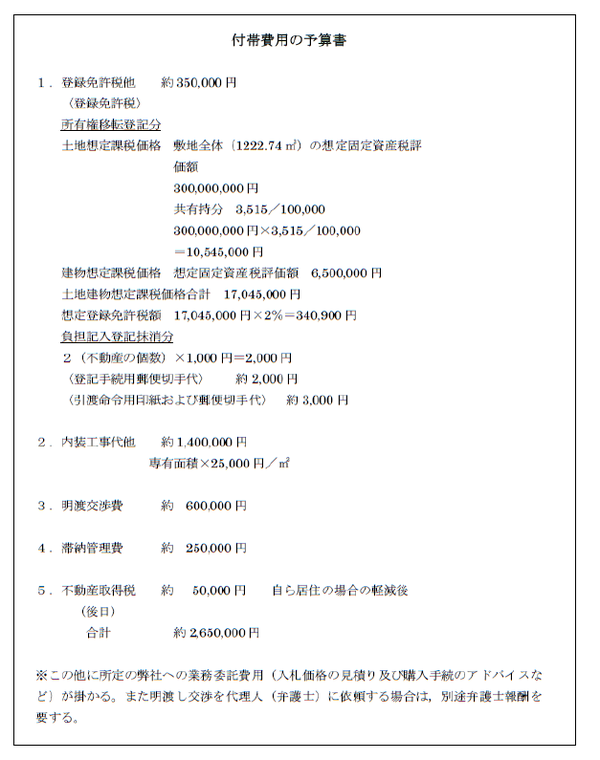 前回の続きである。入札物件を決めた田中さんと、入札価額の検討に入った。まずそれには、買受代金の他にどれだけ付帯費用がかかるかを出してみる必要がある。下記の図表は、付帯費用の予算書である。
