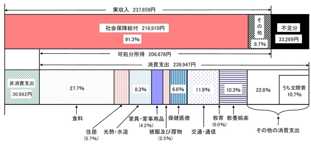 [図表1]と[図表2]を見比べると、支出が15,000円ほど減少したことに加え、収入も約20,000円上昇していることがわかります。社会保障給付以外の収入が増えていることから、定年引き上げにより収入を得る65歳以上の世帯が増加していることも考えられますが、やはり、“1年で起きた変化”と言うには大きすぎるでしょう。