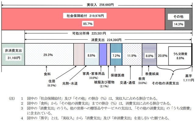 65歳以上の夫婦のみの無職世帯(夫婦高齢者無職世帯)について見ていくと、1ヵ月あたり実収入は256,660円、消費支出は224,390円となっています。実収入の85.7%は社会保障給付。表の右側に目を向けると「黒字 1,111円」と記されています。支出を収入が上回るという結果です[図表1]。