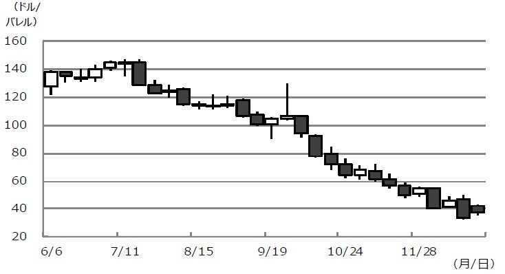 なお、WTI原油先物価格は、2008年7月に史上最高値をつけた後、世界的な金融危機の発生で原油需要が急減し、下落に転じました(図表1)。